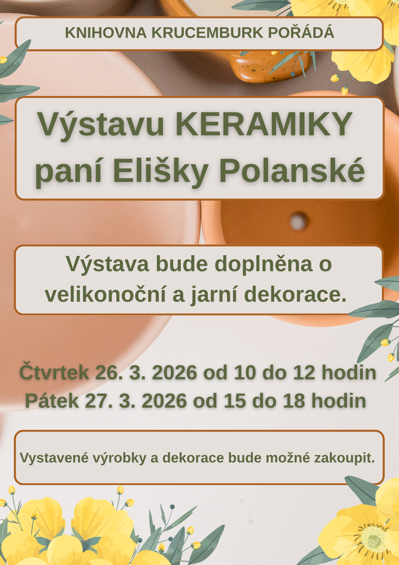 Přijďte si prohlédnout keramické výrobky paní Elišky Polanské, které budou doplněny o velikonoční a jarní dekorace.